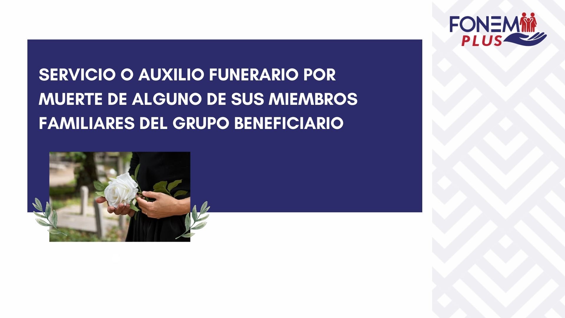 El auxilio se otorga por el fallecimiento de uno de los miembros de la familia del grupo de beneficiarios registrado en FONEM PLUS Y cubre el servicio exequial a nivel nacional.
