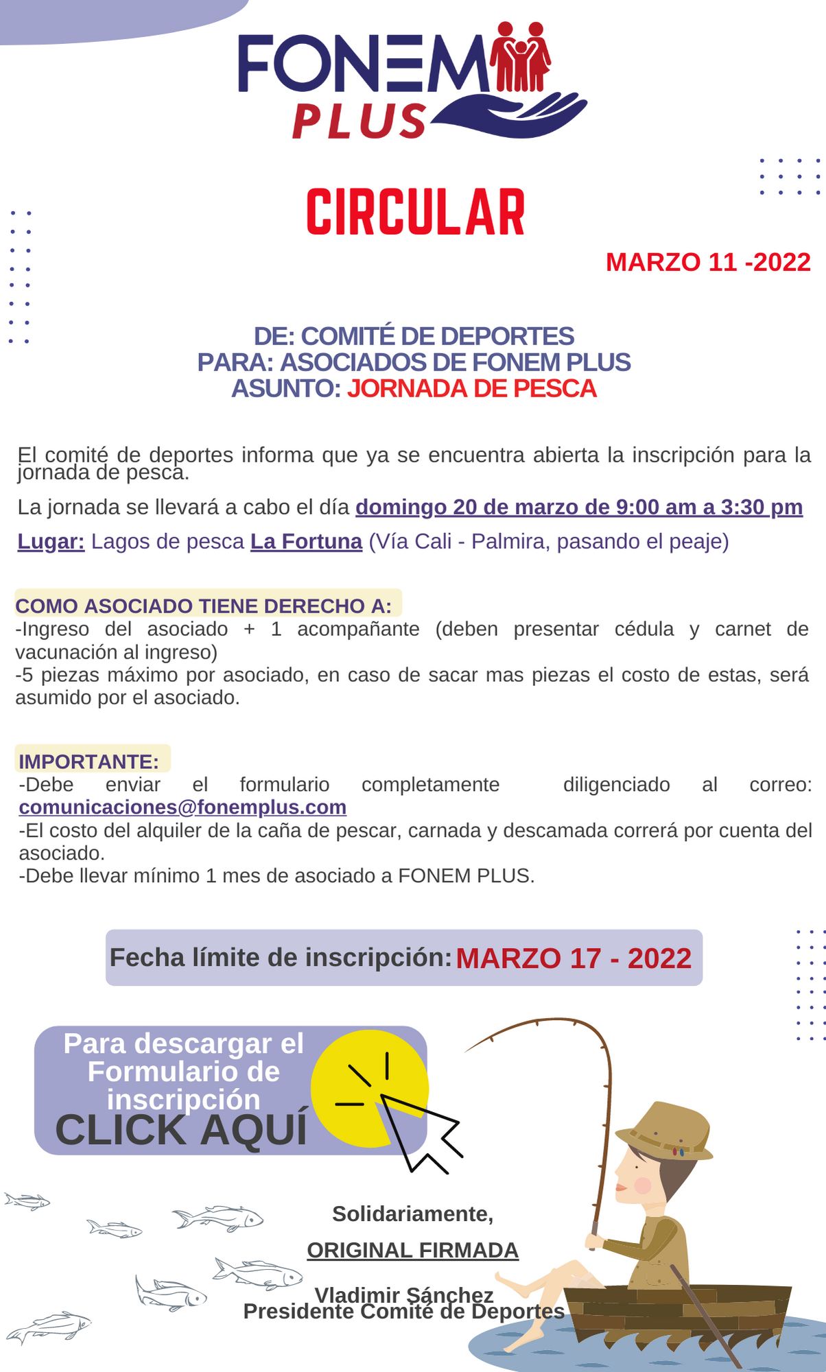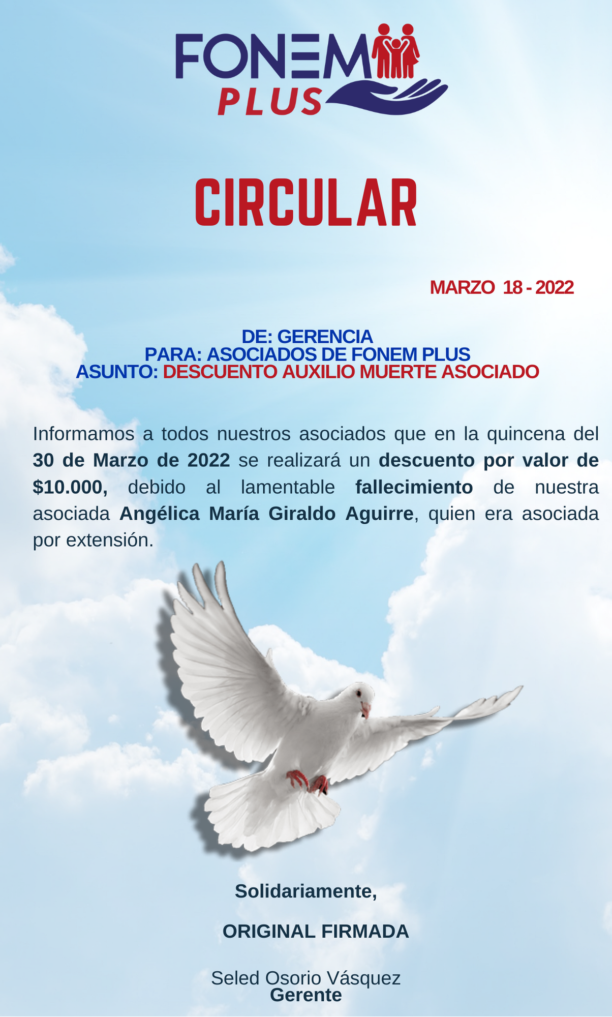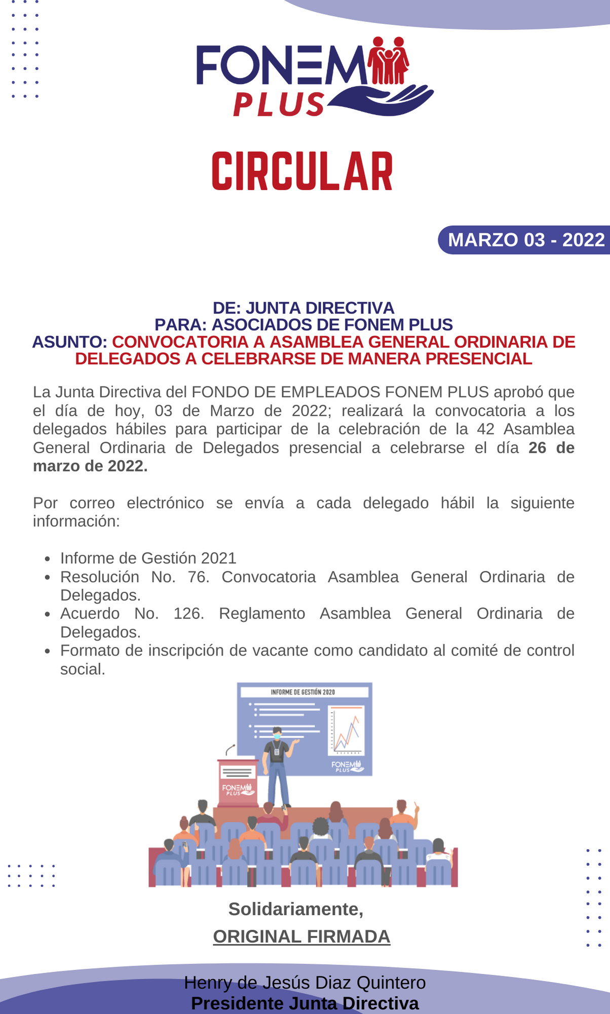 Apreciado asociado, le compartimos la circular donde informamos la fecha de la Asamblea General Ordinaria de Delegados de FONEM PLUS 2022