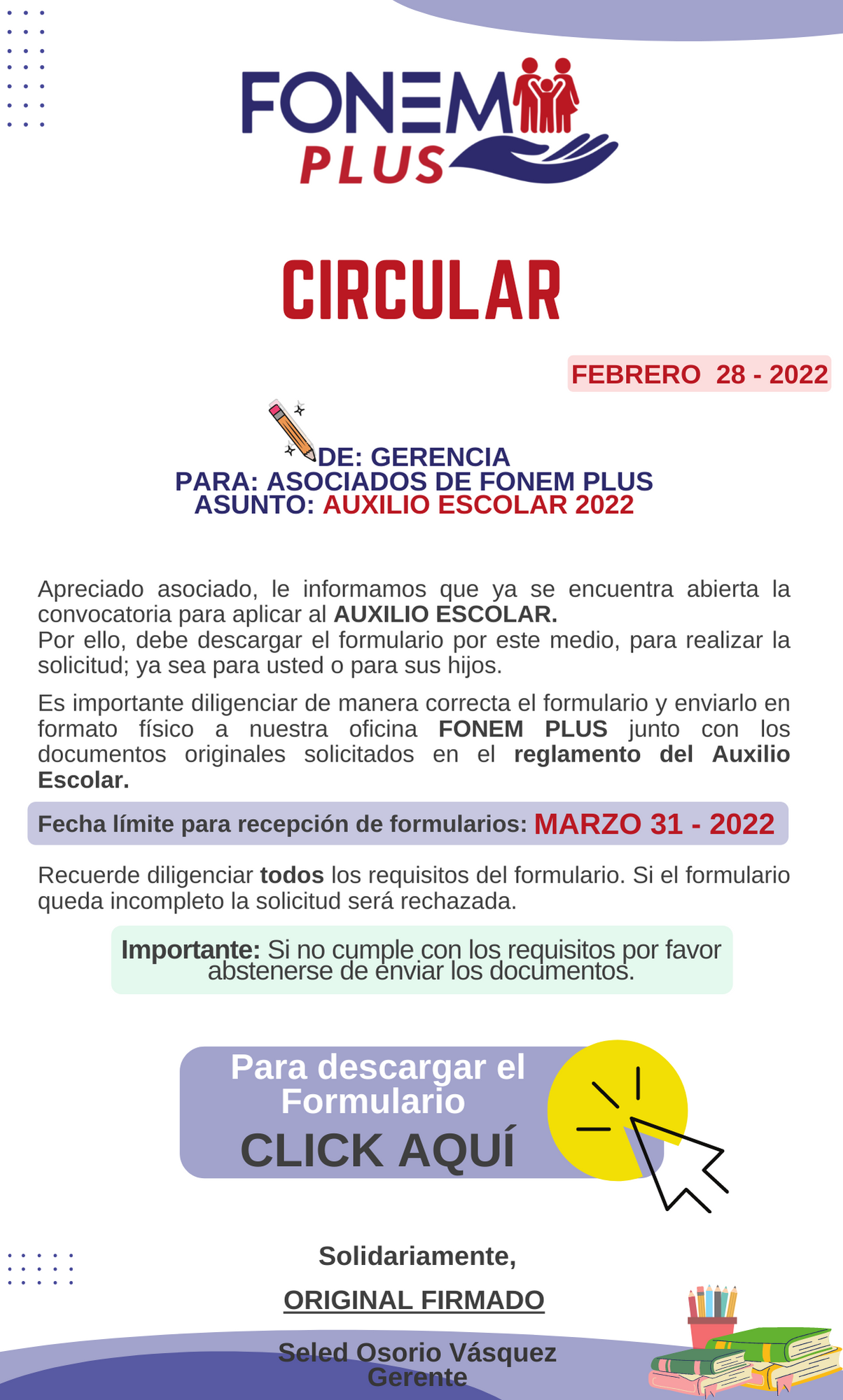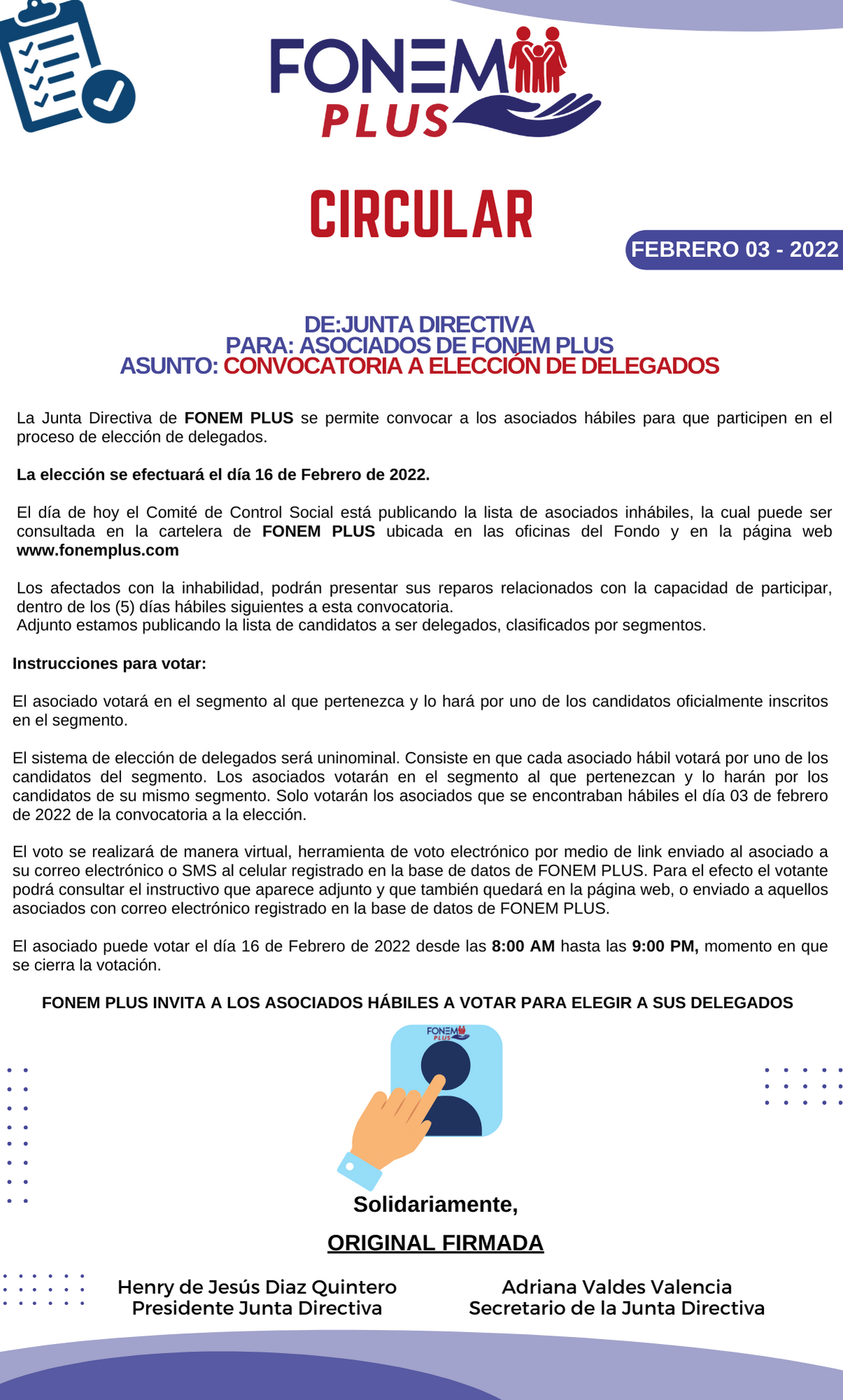 Apreciado asociado, le compartimos la circular donde informamos el proceso de elección de Delegados de FONEM PLUS.