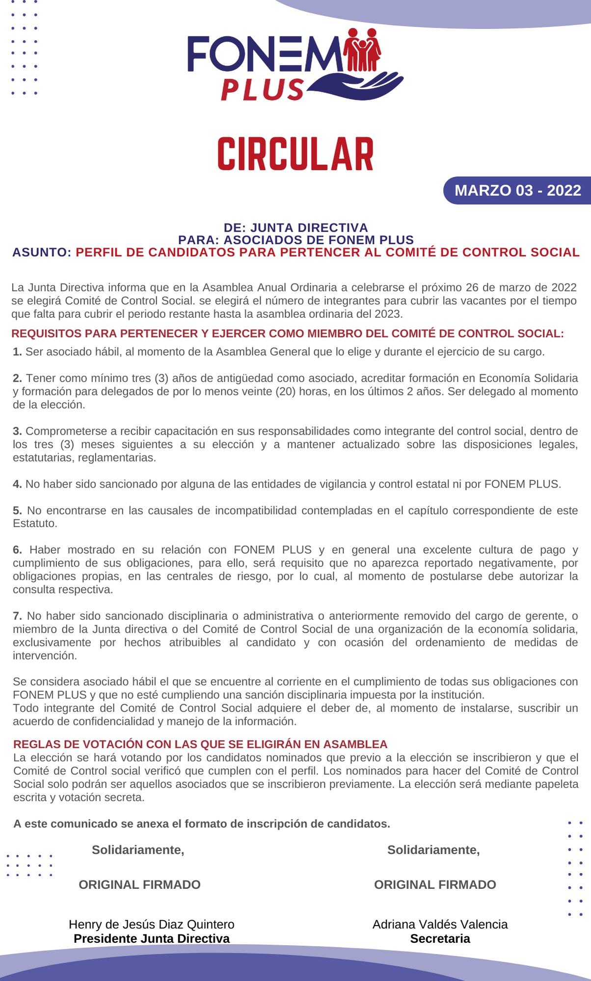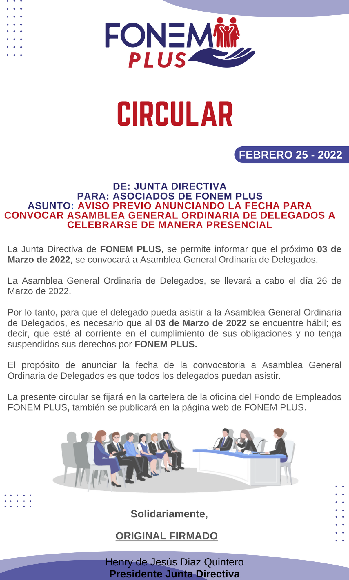 Apreciado asociado, le compartimos la circular donde informamos los asociados elegidos como Delegados de FONEM PLUS 2022