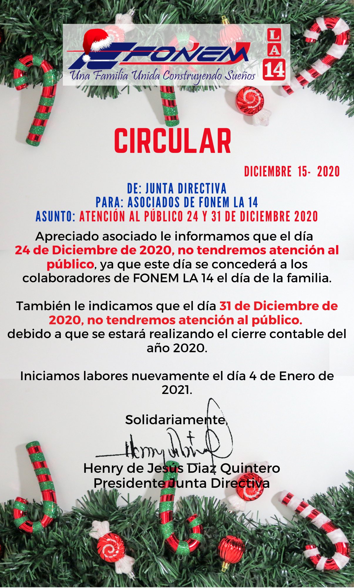 Apreciado asociado, le compartimos el horario de atención de las fechas especiales de Diciembre 2020