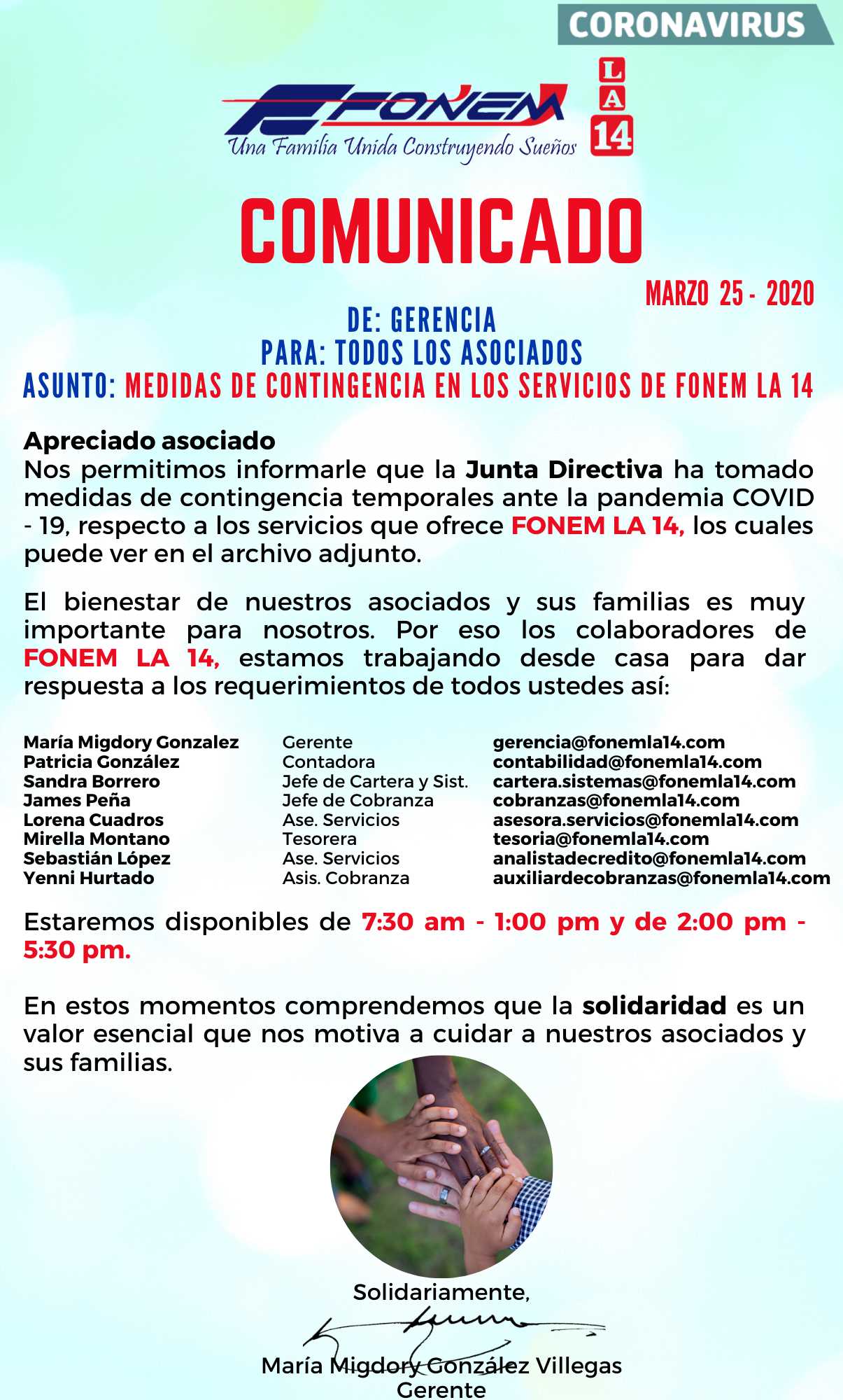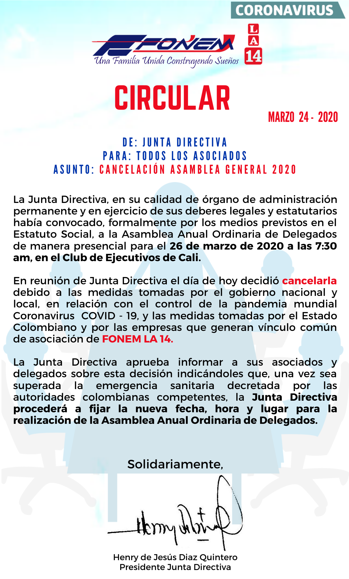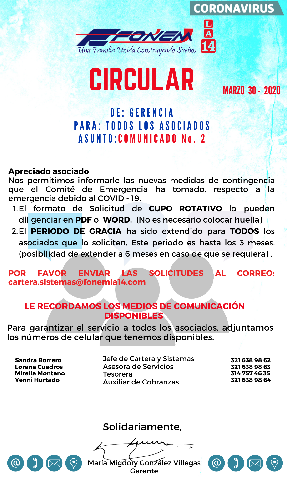 Apreciado asociado le compartimos el Comunicado acerca de las medidas tomadas por la Junta Directiva para la prestación de servicios en FONEM LA 14.