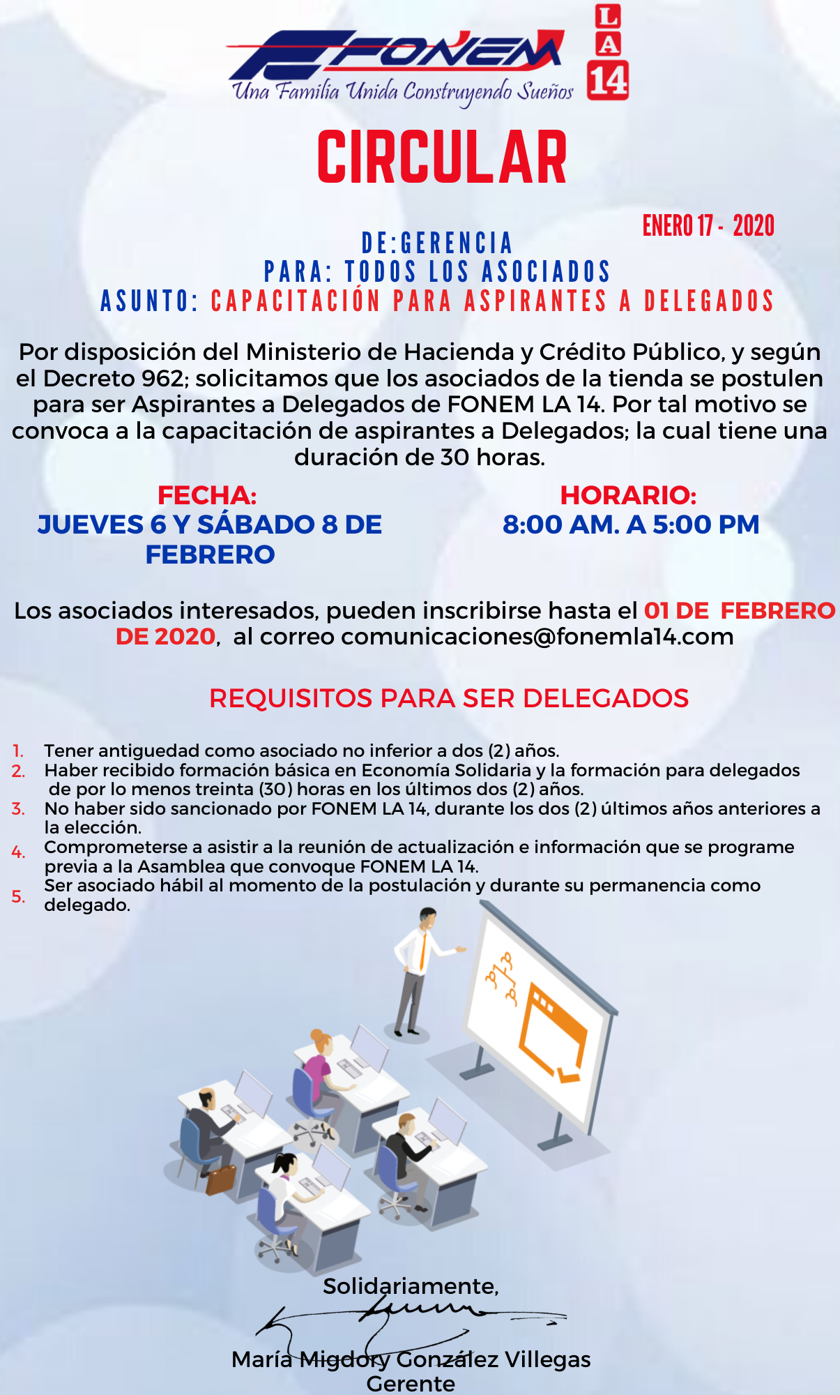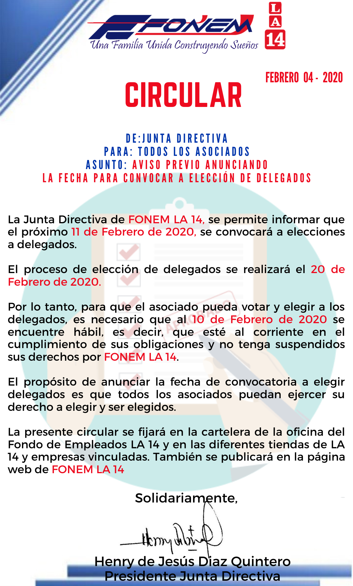 Apreciado asociado le compartimos la información con respecto a la convocatoria para aspirantes a Delegados de FONEM LA 14.