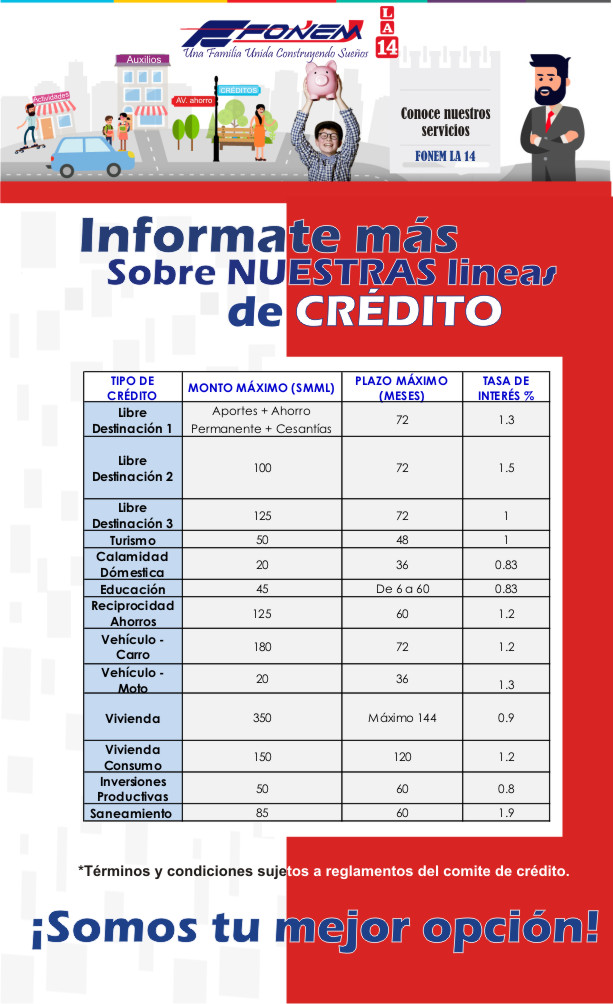 Estimado Asociado, consulte con nuestras asesoras sobre el crédito para compra de mercancía. !Disfrute de todos los beneficios que tiene FONEM LA 14 para usted¡