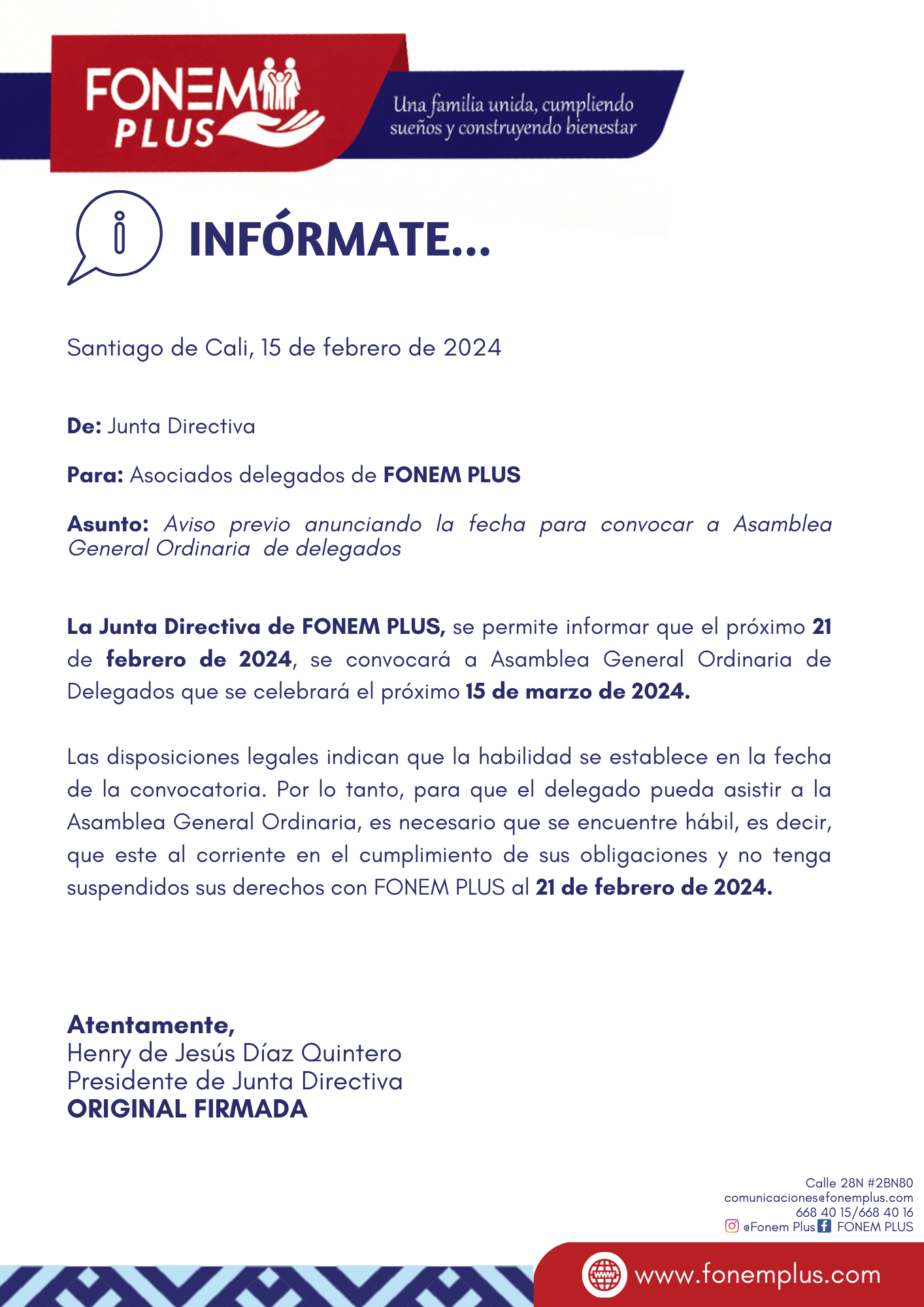AVISO PREVIO ANUNCIANDO LA FECHA PARA CONVOCAR A LA ASAMBLEA GENERAL ORDINARIA DE DELEGADOS