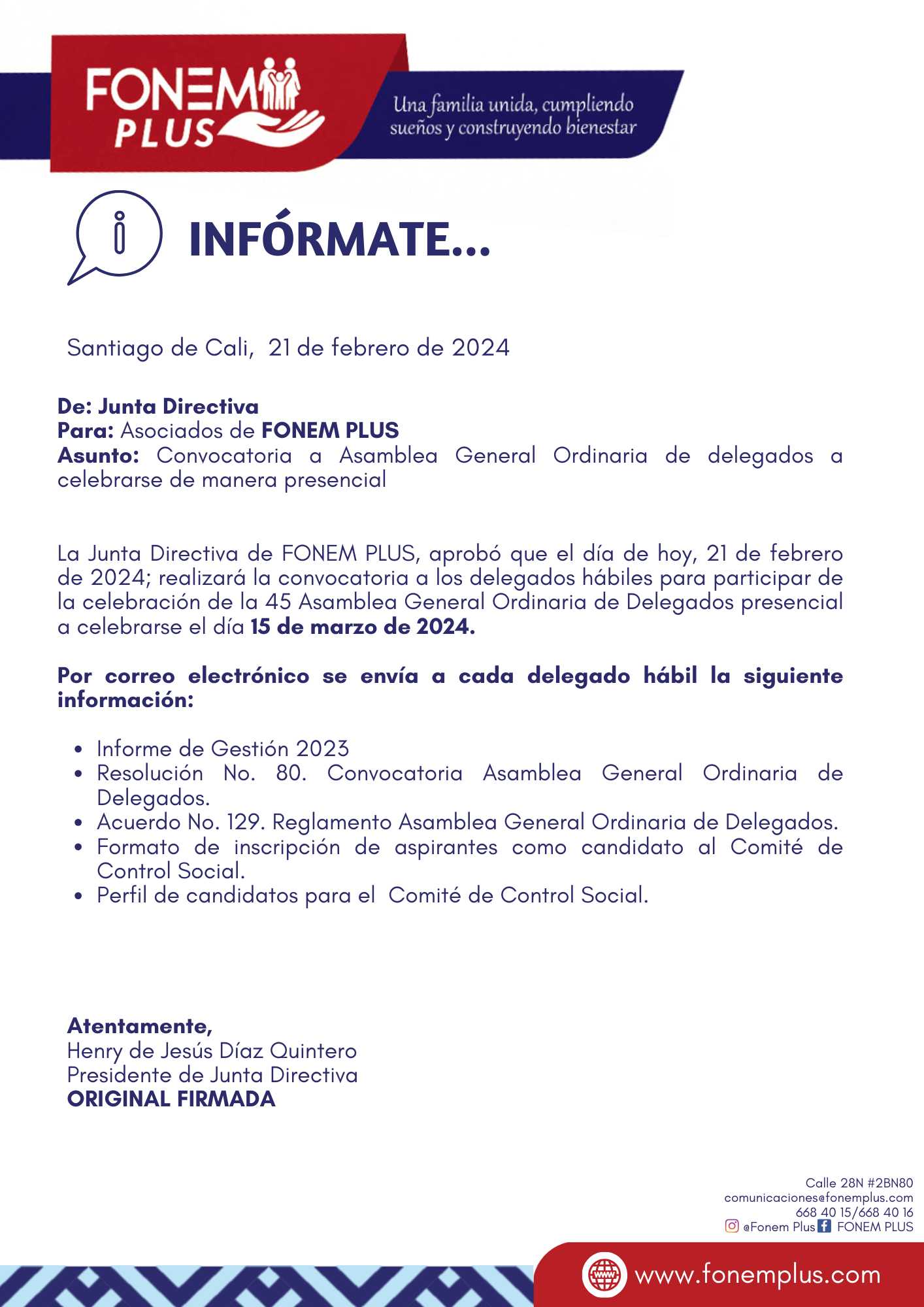 Convocatoria a Asamblea General Ordinaria de delegados a celebrarse de manera presencial