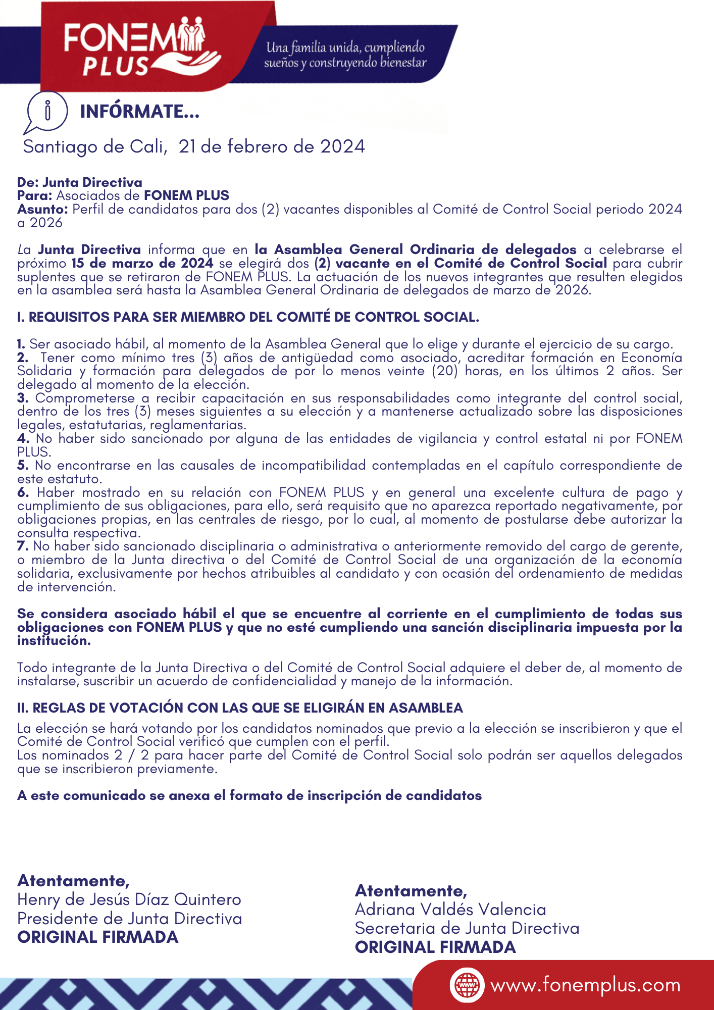 Perfil de candidatos para vacantes disponibles al Comité de Control Social periodo 2024 a 2026